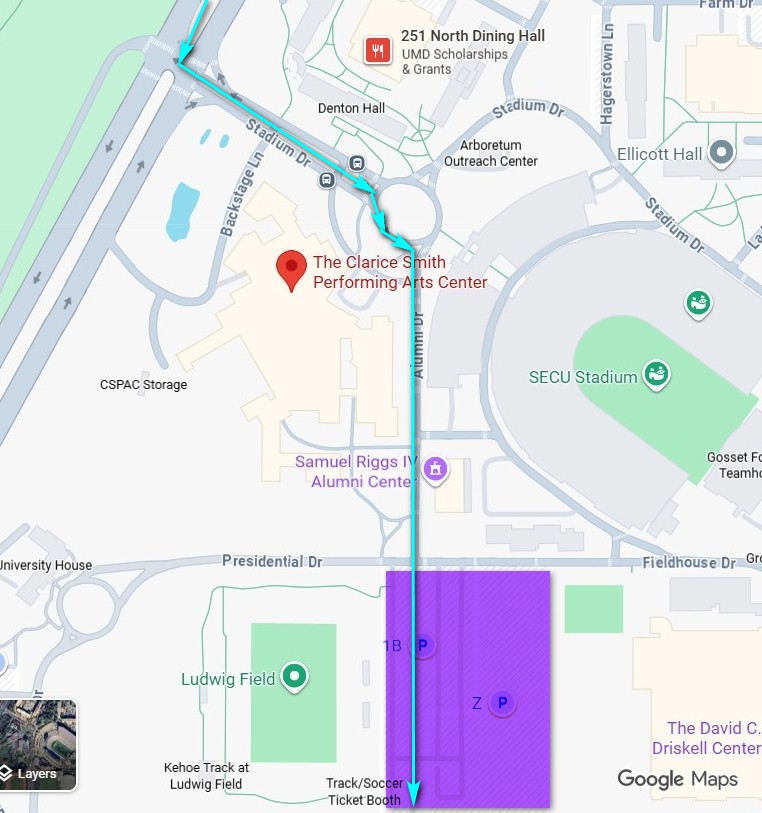 Shaded in purple is the first parking lot you get to, less than a city block away from the Clarice. If it’s full, just keep driving to continue through other, larger parking lots, all free.