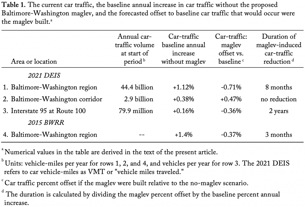 The DEIS finds a rather small reduction in car traffic on Interstate 95 at Route 100 in Elkridge. At this location, current traffic is 218,700 cars per day (Appendix D2, Table D2-16, pg. A5-26). The DEIS forecasts that, were the maglev not built, cars per day would increase by 0.16% each year at this location. The 0.16%-per-year increase comes from the DEIS-supplied 4.07% increase in 25 years (0.16% = 4.07% ÷ 25 and 4.07% = 100%{227.6 – 218.7}÷218.7). The DEIS explicitly states that operating the maglev would reduce car traffic below the baseline level by an offset of 0.36% (Appendix D2, Table D2-16, pg. A5-26). These values are summarized in row 3 of Table 1 of the present article.