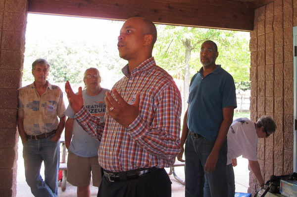 While I was there, the first candidate to visit the club was running for the job of Maryland’s Lieutenant Governor. He’s Delman Coates, the running mate of Heather Mizeur. With Coates are, from left, Frank Gervasi, Michael Hartman, Greenbelt Mayor Emmett Jordan, and again, J Davis.