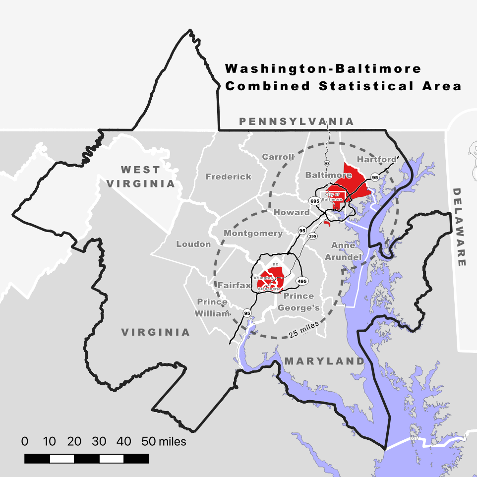 As explored in the present article, even a 25-mile radius seems like an overestimate of the maglev’s reach. Instead, most maglev customers would probably start and end their trips within a small subset of the 25-mile-radius area around each maglev station. The present article suggests that most counties in the Washington-Baltimore Combined Statistical Area would have few if any maglev customers starting or ending their trips there.