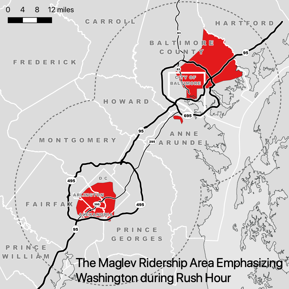 When road traffic is light, the utility of the maglev is limited in several ways. First, only a small portion of downtown Washington and downtown Baltimore would be included in the ridership area, as shown in Figure 4.