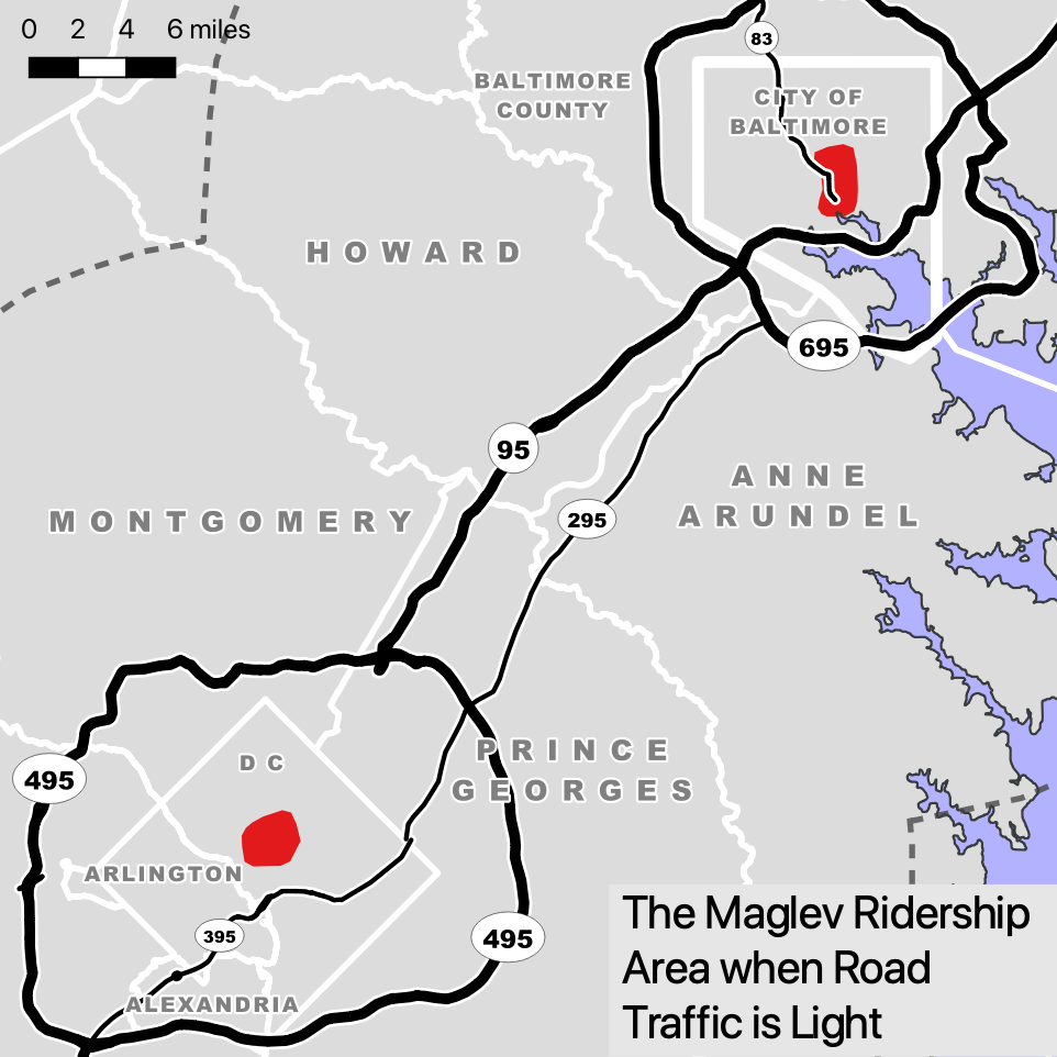 When road traffic is light, the maglev ridership area would be even smaller. It would include, at most, only a portion of downtown Washington and downtown Baltimore. The reason for the maglev’s limited utility when road traffic is light is that there would be fewer maglev trains per hour than during rush hour and car travel would be much faster than during rush hour.