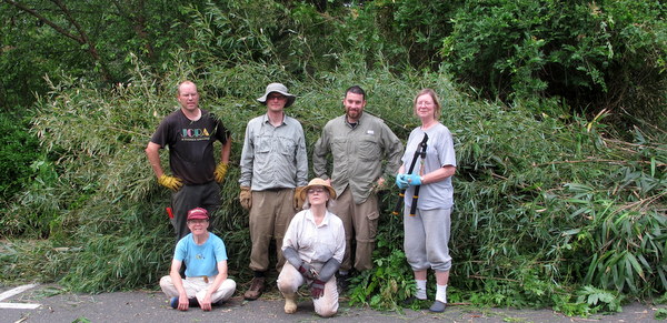 Bamboo warriors pictured in front of just one of the piles of cut bamboo are (back row from left) Richard Olsen, Michael Chesnes, Neil Comperetto and Sonja Junekand  and (front row from left) Mary-Denise Smith and yours truly.